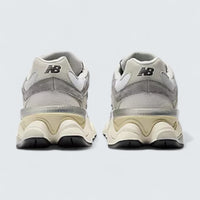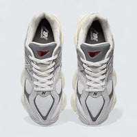 The New Balance 9060 'Rain Cloud Castlerock White' balances futuristic curves with soft greys and crisp white contrast. Mesh and suede uppers blend tonal greys across layered panels for depth and structure. Dual-density cushioning and a sculpted sole ensure standout comfort. A clean, progressive look with retro roots.