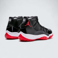 The Air Jordan 11 'Bred' returns with a bold contrast of black ballistic mesh and glossy patent leather buff, set on a crisp white midsole and varsity red outsole.
