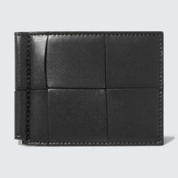 The Cassette Bifold Cardholder with Money Clip 'Black' by Bottega Veneta redefines minimalism with a sculptural, geometric weave.