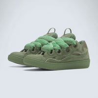 The Lanvin Curb Sneakers in Olive Green are a bold, '90s-inspired design featuring an assertive silhouette with exaggerated volumes. This version is constructed from soft olive green suede, layered with technical mesh underlays for breathability and visual depth. Tonal stitching and overlays maintain a clean profile, while oversized laces in a matching green herringbone pattern add signature Lanvin flair. A quilted tongue featuring the Lanvin woven label and Mother and Child logo sits at the center, while the matching green rubber sole grounds the look with durability and urban edge.
