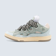 The Lanvin Curb Sneakers in Light Blue and Light Green are a bold, '90s-inspired design featuring an assertive silhouette with exaggerated volumes. Crafted from a combination of smooth leather, suede, and breathable mesh, the upper blends pastel blue and mint green tones for a refreshing, street-ready palette. The sneaker features signature oversized herringbone-patterned laces in black and white, adding graphic contrast. The quilted tongue is finished with Lanvin’s woven label and Mother and Child logo, while the cream-toned midsole and gum outsole complete the look with classic flair and comfort.