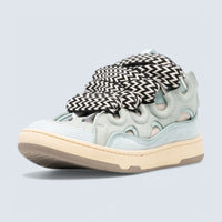 The Lanvin Leather Curb Sneakers in Light Blue are a bold, '90s-inspired design featuring an assertive silhouette with exaggerated volumes. Crafted from a combination of nappa calfskin, suede, and mesh, these sneakers offer both style and comfort. Key features include an almond-shaped toe, waxed and woven double laces with a distinctive herringbone pattern, and a quilted tongue adorned with the Lanvin label and an embossed Mother and Child logo. The padded tongue and metallic eyelets enhance comfort, while the rubber sole ensures durability. Made in Italy, these sneakers epitomize Lanvin's commitment to quality craftsmanship.