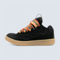 The Lanvin Leather Curb Sneakers in Black are a bold, '90s-inspired design featuring an assertive silhouette with exaggerated volumes. Crafted from a combination of calf suede and mesh, these sneakers offer both style and comfort. Key features include a panelled design, padded construction, front lace-up fastening with contrasting laces, mesh panelling, pull-tab at the tongue, logo patch at the tongue, reflective detailing, round toe, padded ankle, branded leather insole, and a gum-rubber sole.