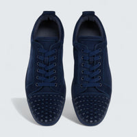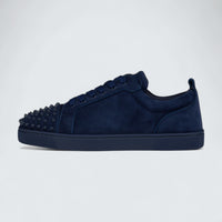 The Christian Louboutin Louis Junior Spikes Veau Velours and Spikes Zaffiro features a low-top silhouette crafted in supple navy veau velours suede with tonal topstitching and a heel pull tab.
