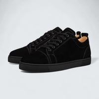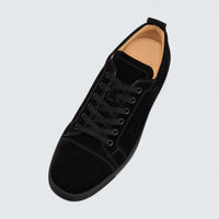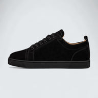 Christian Louboutin Louis Junior Veau Velours Black Sneaker marries vintage sporty charm with high-end Italian craftsmanship and minimalist luxe styling.