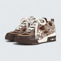 The Louis Vuitton LV Skate Sneaker 'Brown/White' combines 1990s skateboard inspiration with a mix of technical mesh and python-embossed suede, highlighted by Monogram-printed lining and precision padding.
