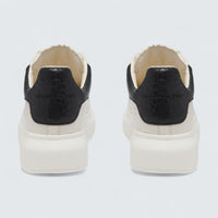 The Oversized Sneaker in Off White Black combines clean ivory tones with a contrasting black heel tab for a sharp visual finish. Smooth calf leather construction is paired with flat cotton laces and a rounded toe. The oversized rubber sole ensures comfort and lift. A refined staple with bold edge.