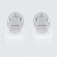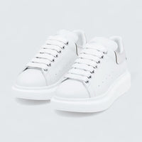 The Oversized Sneaker in White Mirror features a smooth white leather upper accented by a high-shine silver metallic heel tab. Tonal stitching and laces enhance the streamlined silhouette. The oversized rubber sole offers cushioned height and stability. A sleek blend of minimalism and statement shine.