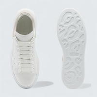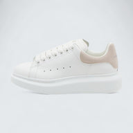 The Oversized Sneaker in White Patchouli combines crisp white leather with a muted pink suede heel tab for subtle contrast. Rounded edges and tonal laces keep the silhouette sleek and minimal. The oversized rubber sole offers signature lift and comfort. A soft color accent on a bold everyday classic.