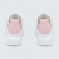 The Oversized Sneaker in White Pink features a white leather upper contrasted by a bright pink suede heel tab. Clean stitching and tonal laces keep the look streamlined and fresh. The oversized sole delivers comfort and elevated style. A vibrant update to the iconic McQueen silhouette.