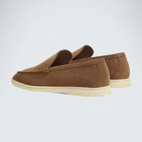 The Loro Piana Summer Walk Loafer 'Dusk' embodies refined minimalism with its sleek silhouette and rich suede finish. Crafted from premium suede in the Dusk hue, it features a full calfskin lining and a lightweight rubber sole. The non-slip rubber sole is embossed with the Loro Piana monogram, ensuring both style and functionality. A timeless design that seamlessly complements sophisticated summer ensembles.