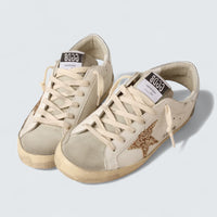 The Golden Goose Super-Star 'Gold Glitter Star and Ice-Gray Suede Inserts' features a white leather upper accented by a gold glitter star and silver metallic leather heel tab. An ice-gray suede tongue and back insert, along with cream-colored laces, enhance its textured appeal. The signature distressed rubber sole offers both comfort and Golden Goose's iconic vintage aesthetic. A handcrafted fusion of shimmer and subtlety, embodying Venetian artistry.