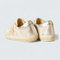 The Golden Goose Super-Star LTD 'Swarovski Crystals and Smoke Gray Leather Star' features a worn white leather upper illuminated by Swarovski crystals, complemented by a smoke-gray leather star and a silver metallic leather heel tab. A worn white nappa leather tongue and inserts, along with white laces, enhance its textured appeal. The signature distressed rubber sole offers both comfort and Golden Goose's iconic vintage aesthetic. A handcrafted fusion of shimmer and subtlety, embodying Venetian artistry.