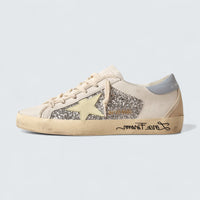 The Golden Goose Super-Star 'Silver Glitter with Yellow Leather Star and Powder-Blue Heel Tab' blends vintage flair with modern edge. Its upper features shimmering silver glitter panels, contrasted by a light yellow leather star and a powder-blue leather heel tab for a pop of color. Beige suede accents and cream laces complete the look, while the iconic handwritten "Love Forever" on the midsole adds a personal touch. A standout piece for those who appreciate bold, expressive design.