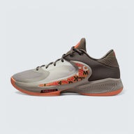 The Nike Zoom Freak 4 'Letter Bros' showcases a fall-inspired palette, combining Ironstone, Orange Trance, Cobblestone, and Sail hues. The upper features a breathable mesh base with synthetic overlays, providing durability and support. A distinctive backward Swoosh on the lateral side incorporates a collage of letters, adding a unique visual element. Giannis Antetokounmpo's personal branding is present on the tongue and insole, highlighting his signature line.
