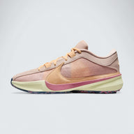 The Nike Zoom Freak 5 'Fossil Stone' channels the warm tones of a desert sunset into a performance-ready basketball silhouette. The upper combines Fossil Stone leather overlays with breathable knit sidewalls and mesh tongues, offering both durability and ventilation. Celestial Gold accents highlight the embroidered logos on the tongue and heel, while the laces and suede midfoot Swoosh feature this eye-catching hue. An Alabaster-tinted midsole and a marbled rubber outsole complete the design, providing a striking visual appeal.