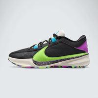The Nike Zoom Freak 5 'Made in Sepolia' pays tribute to Giannis Antetokounmpo's roots in the Sepolia neighborhood of Athens, Greece. The upper features a black mesh base adorned with a tonal geometric pattern, complemented by leather overlays along the toe, eyestays, and collar. An oversized Lime Green Swoosh graces the lateral side, while a Fuchsia Dream mini Swoosh appears on the medial side, adding vibrant accents. Baltic Blue details on the tongue and a multicolored rubber outsole complete the design, reflecting the dynamic energy of Giannis's hometown.